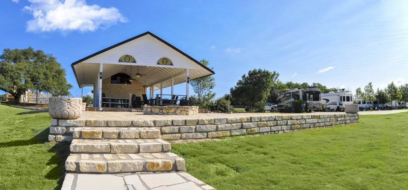 Covered pavilion available with tables, chairs, gas grill and mega fire pit, overlooking the Blanco River